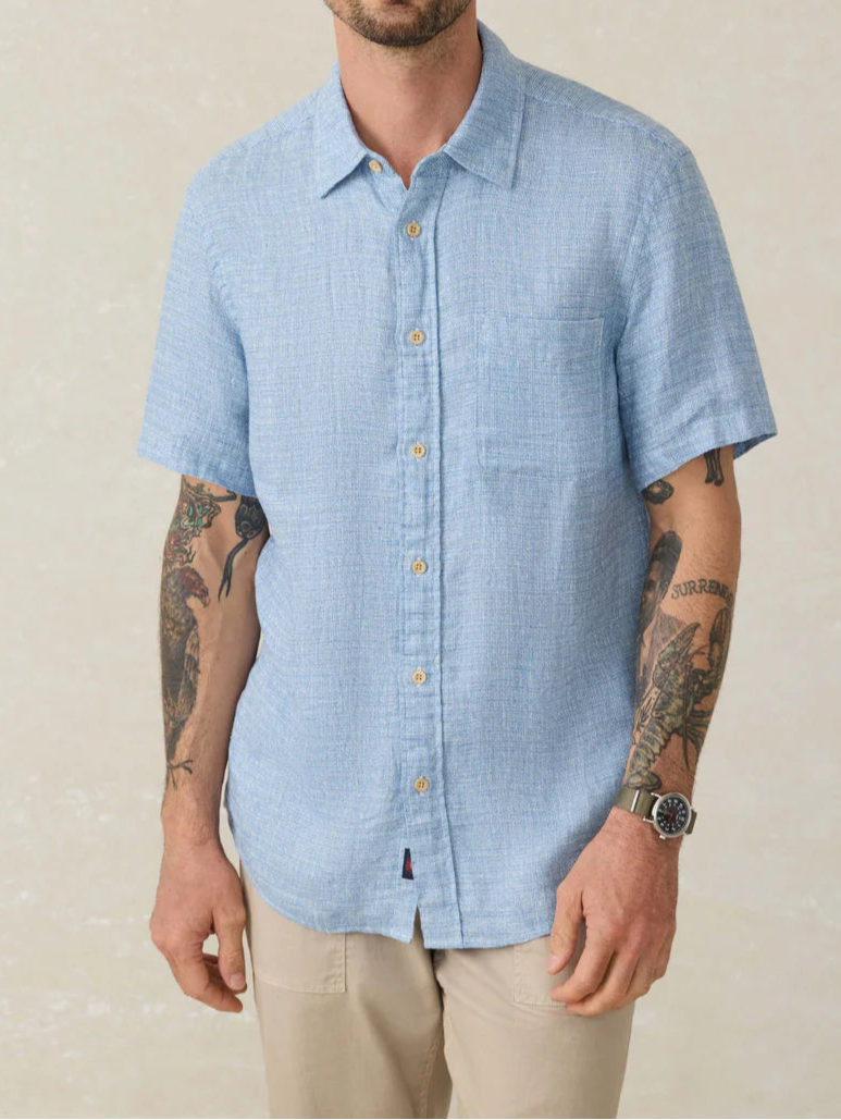 The Palma Linen Shirt – Blue Basketweave is an easy upgrade to your warm-weather wardrobe. Woven from premium linen, its subtle basketweave texture adds depth and interest to a classic coastal staple.