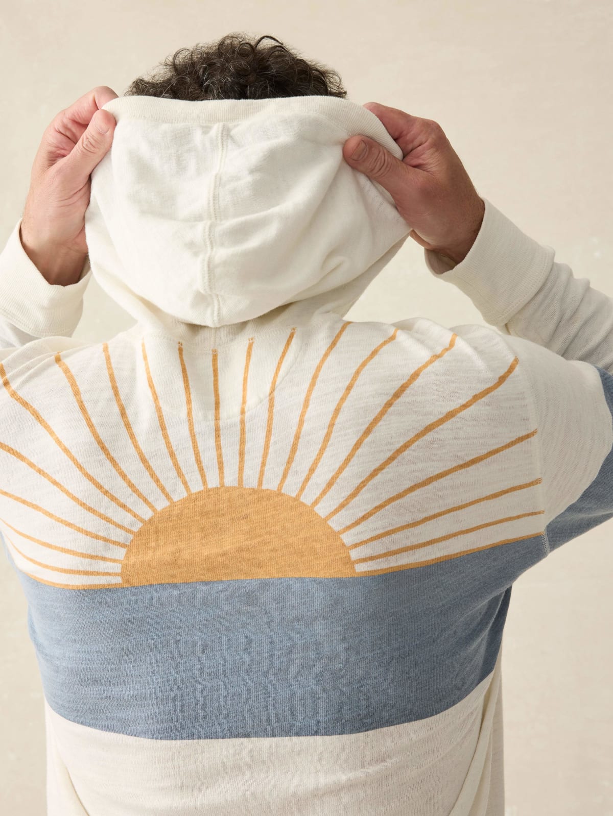 - Detail: Popover style. Hood with cotton drawcord. Long sleeves with fitted rib cuffs. Rib knit hem. Woven Sun & Waves label at wearer's left hem.