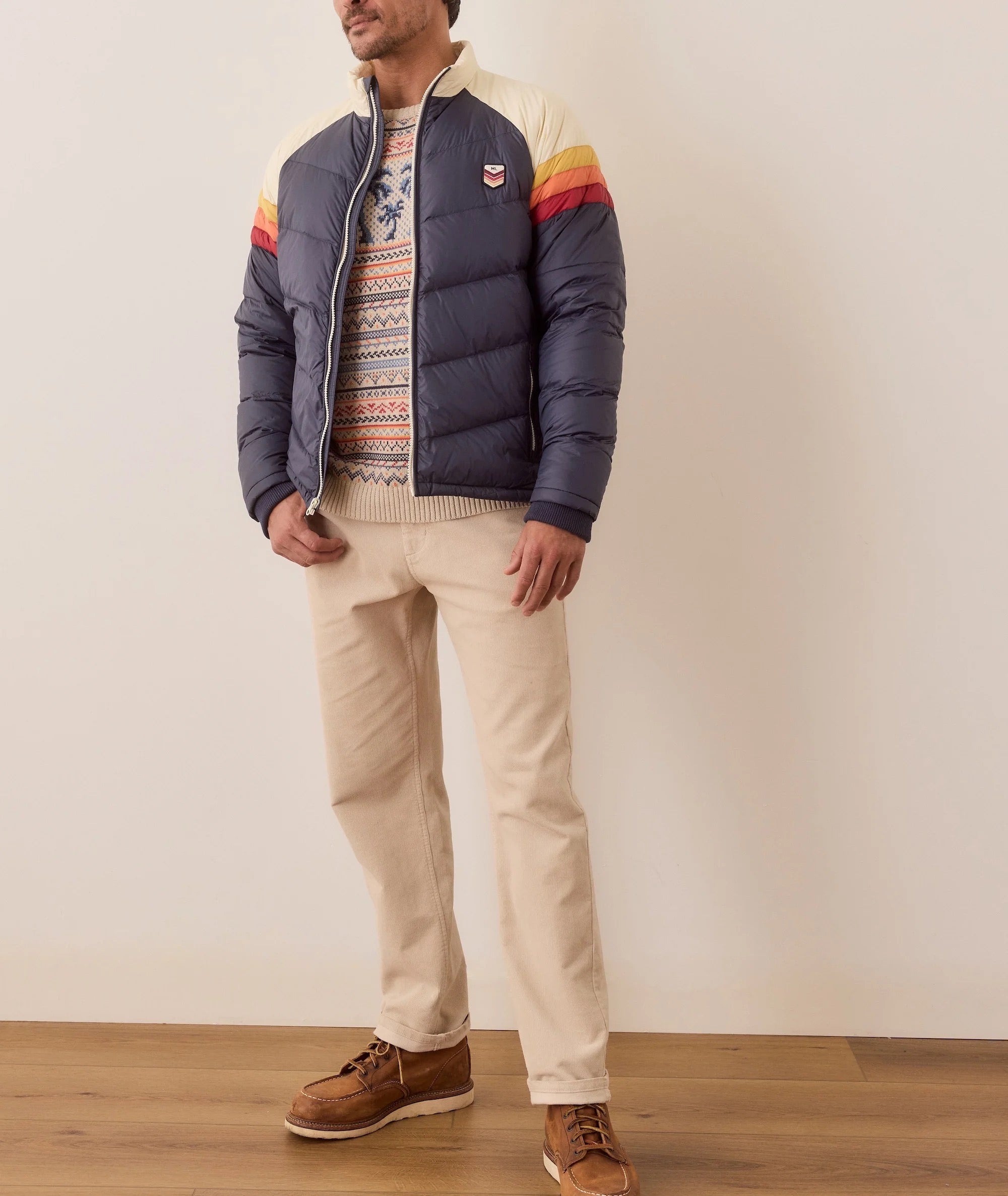 Meet the Archive Boreal Puffer Jacket — a timeless style with modern updates. Designed with contrast shoulder detailing, a mock neck, and sunset chevron stripes that wrap around the back, this puffer stands out while keeping you cozy. The quilted chevron paneling adds structure, while ribbed inner sleeve hems and a cinchable bungee hem lock in warmth. Sleek contrast zippers on the body and hand pockets give it a refined edge, and the embroidered ML Archive logo on the chest adds a finishing touch.
