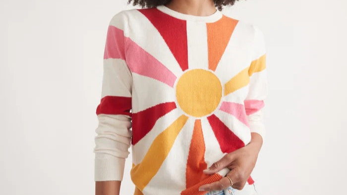 Move over, gray sweaters. There's a new knit in town. This lightweight sweater is paired with a classic Marine Layer sun icon, and warm colors to carry you through the season.