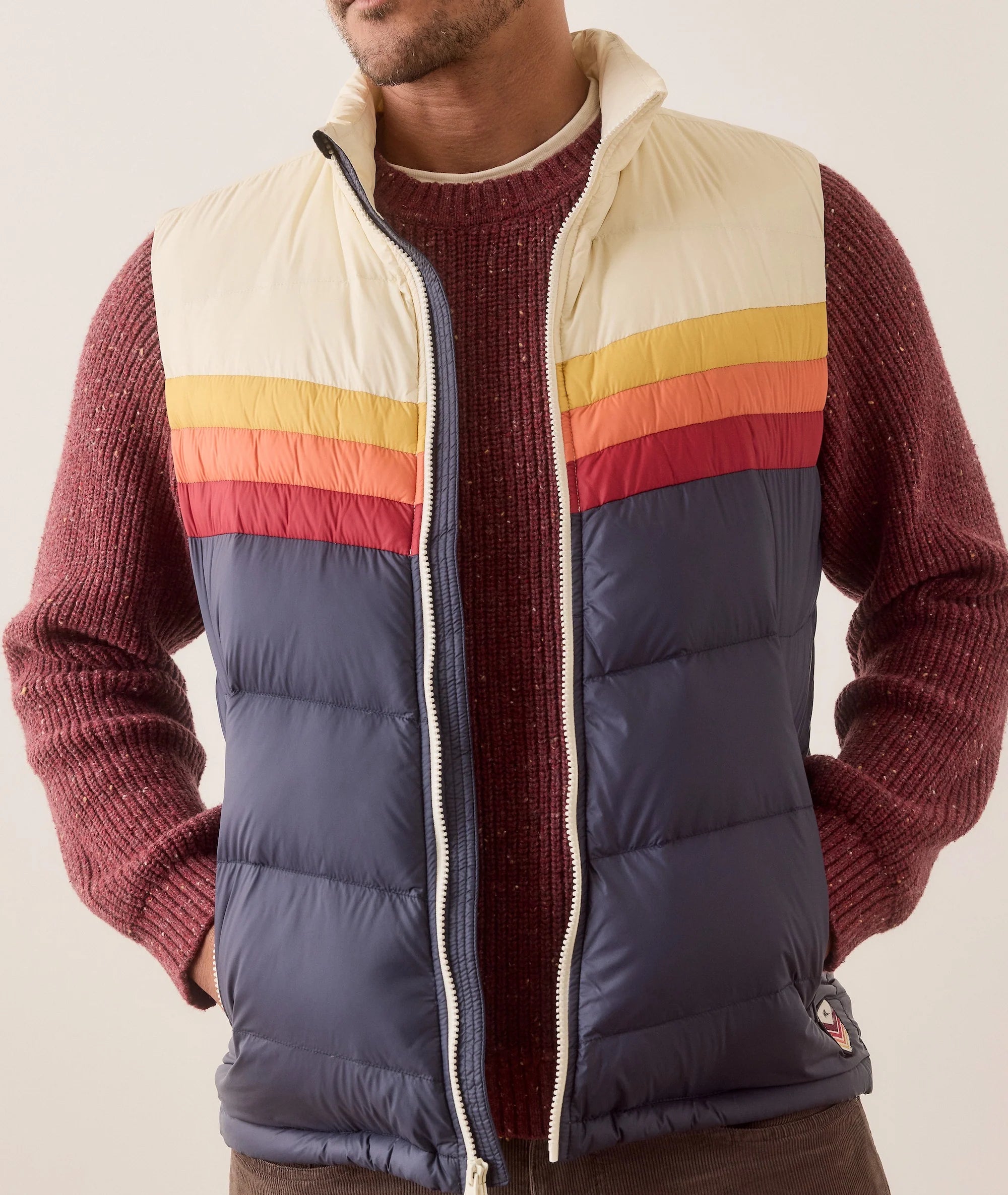 Meet the Archive Boreal Puffer Vest — a classic style with modern updates. This vest features contrast shoulder detailing, a mock neck, and sunset stripes in a chevron design that wraps around the back. The quilted chevron paneling adds structure while ribbing on the inner sleeve hems and a bungee closure at the hem keep warmth in. With contrast zippers on the body and hand pockets for a sleek touch, and the embroidered ML Archive logo on the left chest, this puffer is designed for style and comfort all season long.
