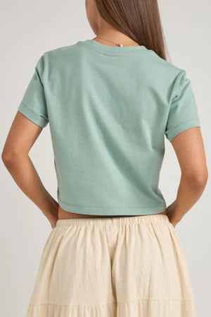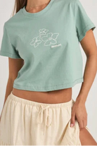 Stay cool and chic in the Embroidered Rhythm Crop Crew Tee. This sage-hued, relaxed fit tee features charming floral embroidery that adds a touch of whimsy to your casual look. Perfect for breezy beach days or spontaneous coastal strolls, it combines comfort and style effortlessly. Make every day feel like a seaside escape with this playful, must-have crop tee.